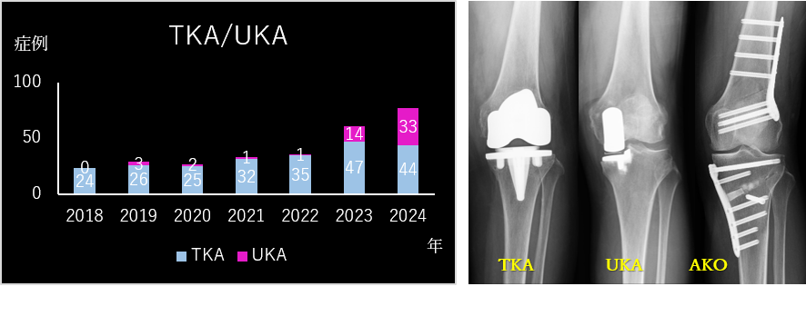 | 膝関節周囲骨切り術(AKO) | 脛骨や大腿骨の一部を切って下肢の変形を矯正し、ご自身の膝関節を温存します。 | 【1件】 |