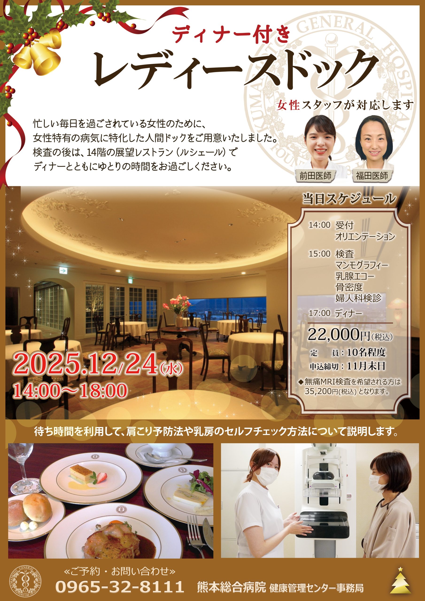 女性のための「レディスドック」を実施いたします。 マンモグラフィーや乳腺エコー、婦人科検診をすべて女性スタッフが担当し、安心して受診いただけます。 検査後は、14階展望レストランでのディナーをご用意しております。