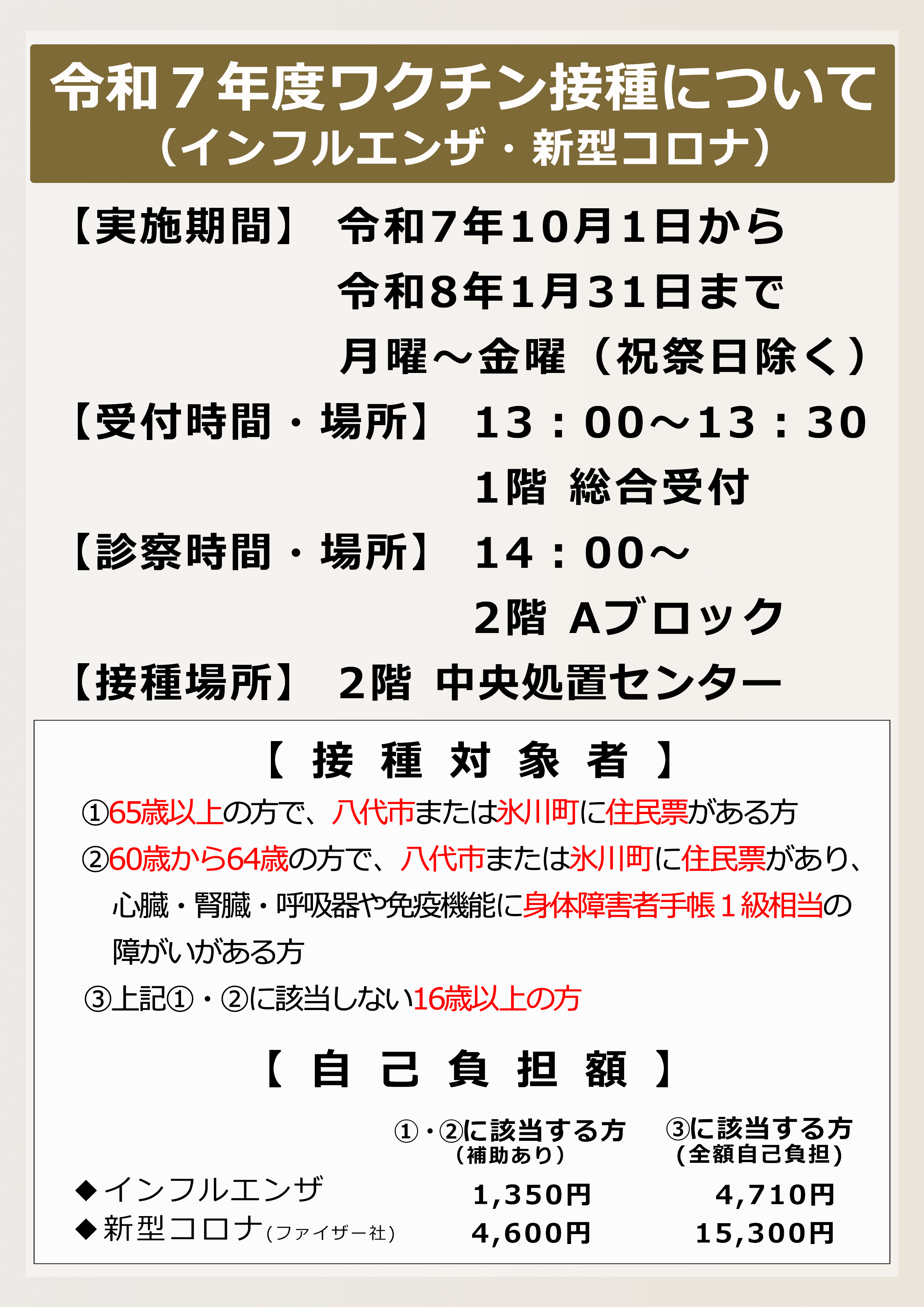 今年度のインフルエンザおよび新型コロナワクチン接種のご案内です。予約は不要ですので、実施期間・受付方法・自己負担額をご確認のうえご来院ください。